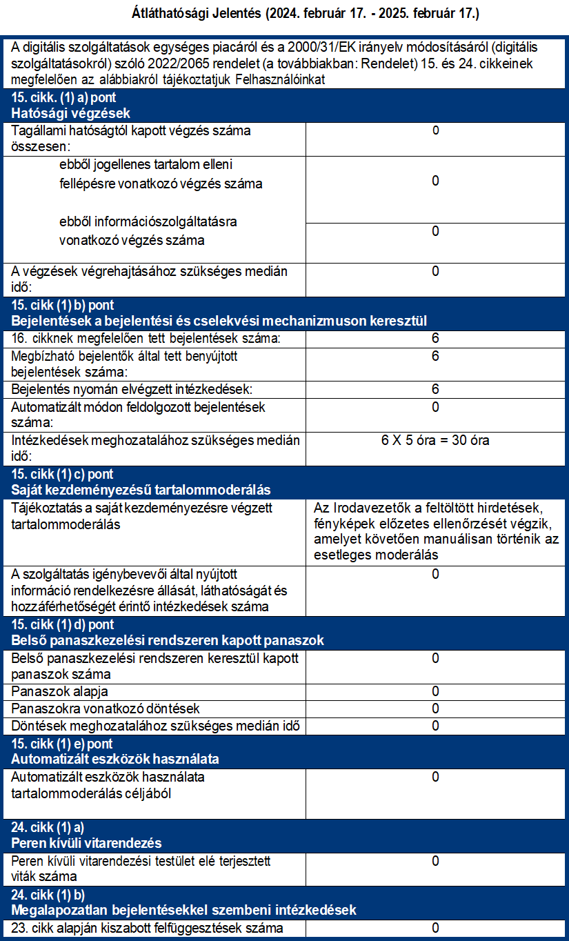 a Duna House Franchise Kft. – mint a www.dh.hu online platformot üzemeltető szolgáltató – az alábbiak szerint tesz eleget az Európai Parlament és a Tanács 2022. november 16-án hatályba lépett, a digitális szolgáltatások egységes piacáról és a 2000/31/EK irányelv módosításáról szóló, 2022/2065 számú rendelet (a továbbiakban: DSA) szerinti adatszolgáltatási kötelezettségének.