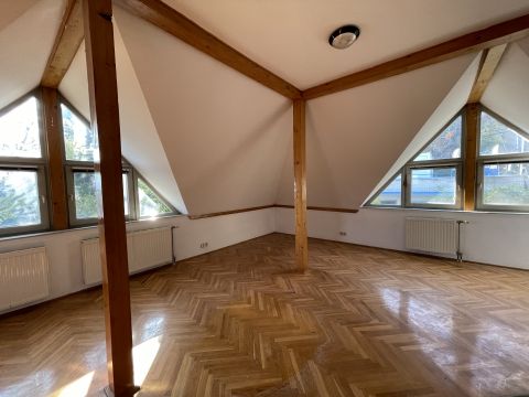 Tetőtérben egy nagy, világos tér, amelyhez fürdőszoba tartozik, alkalmas lehet dolgozószobának vagy gyerekszobának.