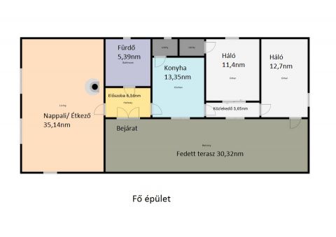 -A főház 106nm-es: 3 szoba, egy fürdőszoba, tágas konyha kamrával , két tágas hálószoba , és egy 30nm-es fedett terasz található benne, mely az év bármely szakaszában kikapcsolódást biztosíthat egy kellemes könyv, vagy egy jó kávé mellett,miközben a rendezett kert látványát élvezheti. így a család minden tagja számára kényelmes és praktikus megoldást nyújt.