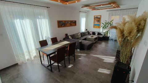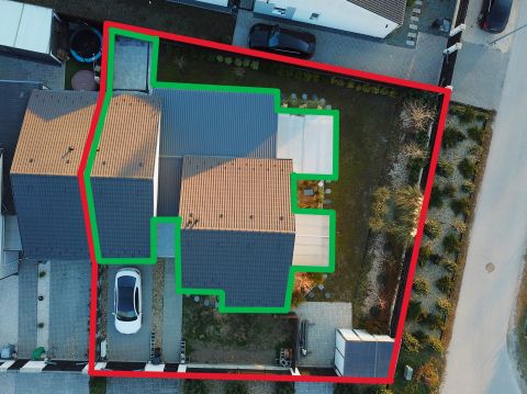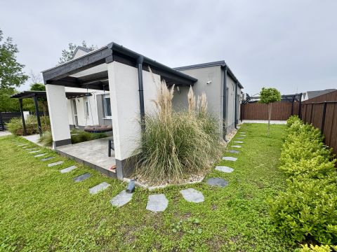 A ház 115 m2 hasznos alapterületű, melyhez 3 terasz tartozik. Teraszok mérete: 16 nm + 12 nm + 10 nm, 2 fedett, 1 napvitorlás.