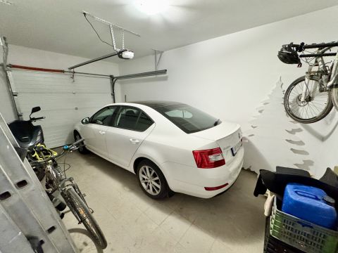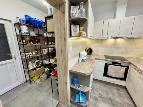 A garázsból közvetlen átjárás lehetséges a kamrába és a konyhába. A kamra nagy és kényelmesen átjárható közvetlenül a konyha és a garázs között helyezkedik el, beépített polcrendszerrel, és téligumi tárolóval felszerelt.