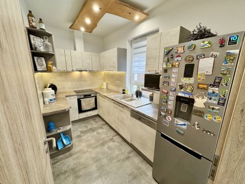 Egyedi tervezésű és építésű konyha, magas minőségű gépekkel (A++). Indukciós lap, elszívó, elektromos sütő, mikró, hűtő, mosogató gép, kő mosogatótál. Külön beépített vízszűrő rendszer, kristály tiszta ivóvíz!