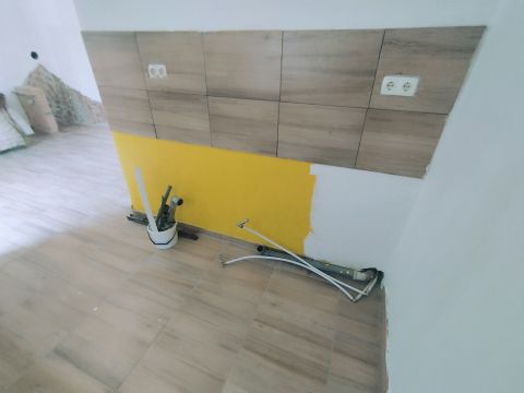 A szobában laminált parketta, a konyha/étkező járólap borítást kapott, a fürdőszoba metlaki burkolású.