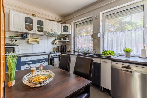 Tartozik hozzá egy ZÁRT GARÁZS, amelyből szintén ki lehet jutni a hátsó kertbe. A telken még egy autó parkolására van lehetőség az előkertben, a ház előtt további két gépkocsi számára biztosított parkolóhely – így a vendégeknek sem kell soha parkolóhelyet keresniük.