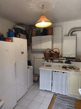 A házban padlófűtés ad meleget, amit vízteres cserépkályha, vagy gázkazán biztosít.
