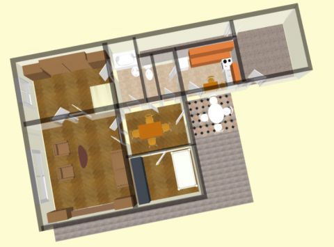 Elosztás: tágas nappali, három szoba, konyha, előszoba, fürdőszoba és külön WC.