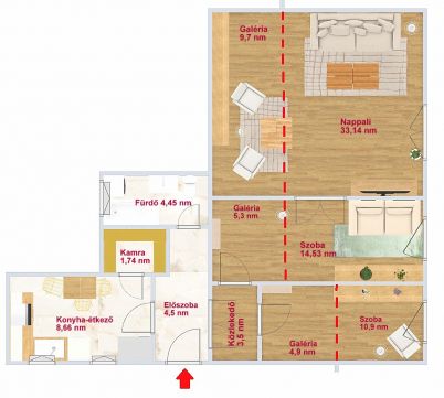 Amit érdemes tudni róla: + Tulajdoni lapon 2 szobás, de átalakítás miatt 3 szobás lett. + Tégla építésű társasházban. + A lakás átlagos állapotú. + Nyílászárók műanyagra ki lettek cserélve. + Új biztonsági bejárati ajtó került beépítésre. + Villanyhálózat a konyhában és a fürdőszobában kicserélésre került. + Mind a három szoba állógalériával rendelkezik - a nappaliban fémvázas gipsszkarton burkolással, a másik kettőben fa szerkezetű. + Fűtésről a gáz konvektor és a fa tüzelésű cserépkályha gondoskodik. + A pincében lakattal zárható saját tárolóval rendelkezik. + Közös költség: 28.400 Ft, amely tartalmazza a vízdíjat, a közös vízhasználatot, a lépcsőház takarítását-karbantartását, megtakarítást és biztosítást.