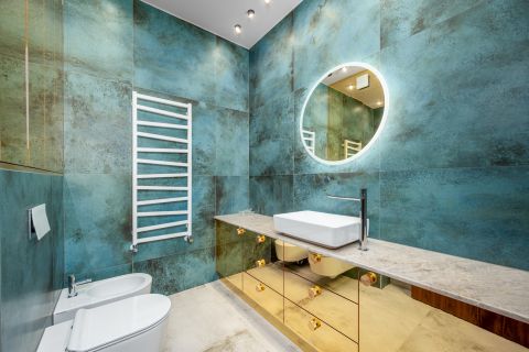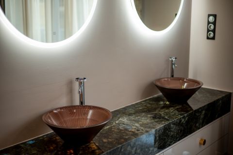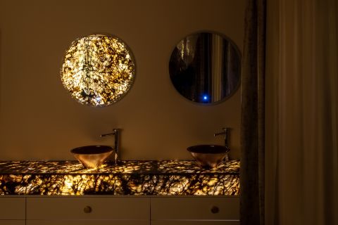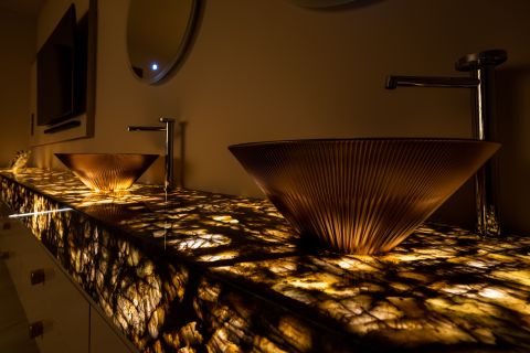 - Resopal arany dekor mosdószekrény Naica kvarcit pulttal