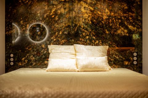 - Egyedi gyártású franciaaágy edzett, laminált üveg ágylábbal, Labradorit Lemurian hátfallal