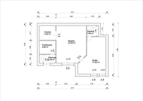 A lakás rendkívül világos, kiváló elrendezésű. Tágas nappalival rendelkezik, melyhez külön helyiségben kapcsolódik a gépesített konyha, kis étkezősarokkal. A hangulatos, nagy méretű hálószobához egy külön gardrób szoba is tartozik. Az előszobából nyílik a zuhanyzós fürdőszoba.