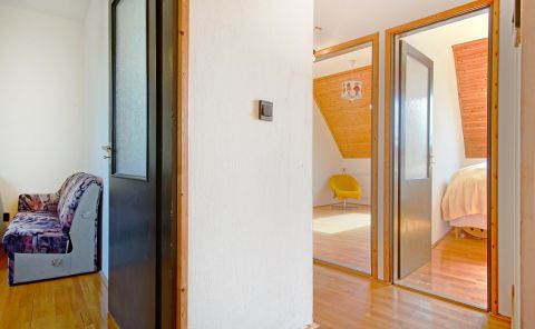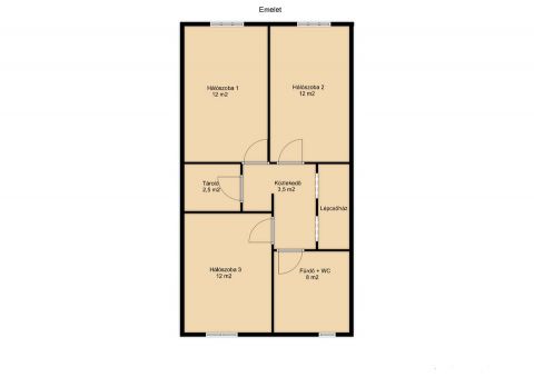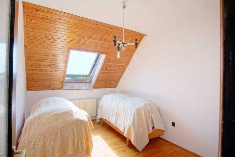 - Emelet: három nagy szoba, tároló és fürdőszoba WC-vel