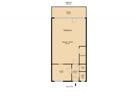 - Földszint: konyha, óriási nappali étkezővel, fürdőszoba WC-vel, tároló, teraszkapcsolat a kerthez