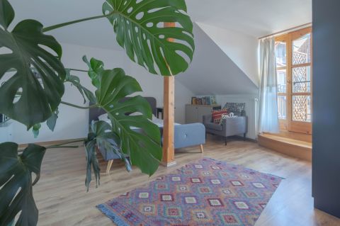 - 3. emeleti, 72 m2-es lakótérrel + 3,3 m2 terasszal rendelkező, belső kétszintes, nagyon hangulatos ingatlan.