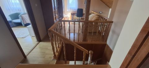 Az utcafront felőli rész földszintjén kényelmes és tágas nappali, étkező, kádas fürdőszoba külön illemhellyel és a közlekedő található. Innen nyílik a lépcső egyfelől a galériás tetőtérbe, másfelől a zárt lépcsőház a szuterént szinthez és a kétállásos garázshoz. A tetőtérben galériás társalgó erkéllyel, két hálószoba, zuhanyzós fürdőszoba, valamint közlekedő található, ahonnan közvetlenül az új rész tetőterébe is érkezünk. Miután ide vezet külső lépcső is, igény szerint külön bejárattal is megközelíthető, de ennek a kialakítása még hátravan. Az újabbik rész földszintjén tágas, amerikai konyhás nappali étkezővel, zuhanyzós fürdőszoba, közlekedő és a kamra van.