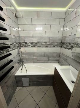 Kádas fürdőszoba törölközőszárítós radiátorral és modern világítással