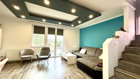 Az ingatlan 115 m²-es, 45 m² alapterületű, saját 140 m²-es térkövezett kerttel, garázzsal, valamint külön bejáratú alsó szinttel rendelkezik, amely irodának, rendelőnek vagy üzleti célra is ideális.
