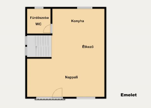Első emelet: nappali + konyha + étkező, zuhanyzó + WC