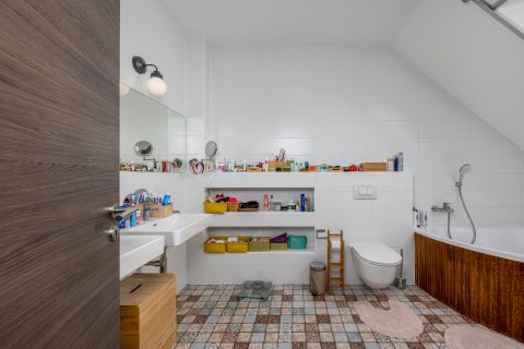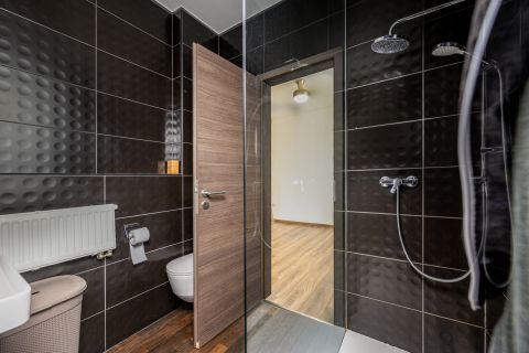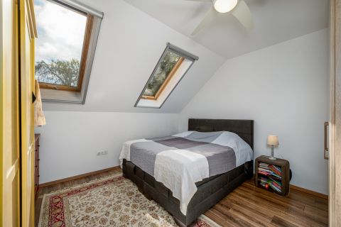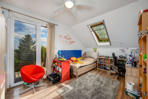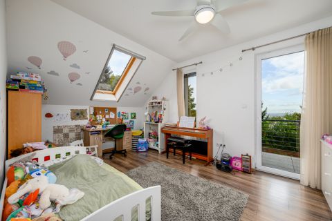 Emelet: 3 hálószoba, tároló, fürdőszoba sarokkáddal és WC-vel, erkély panorámával