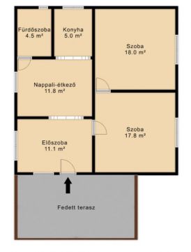 A fedett teraszról belépve a méretes előszobába érkezünk. Innen a nappali-étkezőn keresztül jutunk a konyhába, illetve a fürdőszobába.