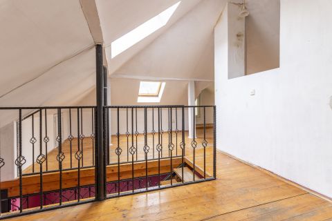 Az emeletre egy masszív, acél szerkezetű lépcsőn lehet feljutni. Itt jelenleg egy légtér va, ami hálószobaként is használható.