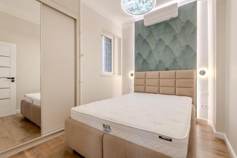 Tágas és Világos Terek: A 55 nm-en két külön szoba (amerikai konyhás nappali + hálószoba) kapott helyet. A nagy belmagasság és a gondos tervezés optikailag tovább növeli a terek érzetét.