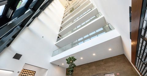 Az épület különlegessége: A társasház nevét a hatalmas belső átriumról kapta, melyet az utcafront felől üvegfal zár le. Az üvegfelület nyolc szinten át fut végig, bőséges természetes fényt biztosítva a belső tereknek – így a lift előtereknek és a recepció résznek is.