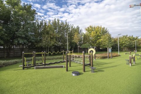 Pihenő ,sétáló területek,fitnesz park( külön,kicsiknek és nagyoknak), játszótér, bográcsozó/sütögető, gyönyörű bokrok,fák, körülötte pihenő padokkal .