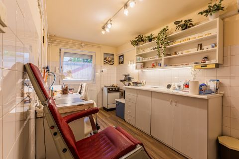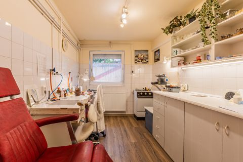 A szuterénben egy teljesen felszerelt fogászati rendelő működik, melyhez fogtechnikai labor is kapcsolódik. A rendelő 1994 óta saját, stabil pacientúrával üzemel, korszerű röntgennel és minden szükséges engedéllyel, így azonnal folytatható a praxis.