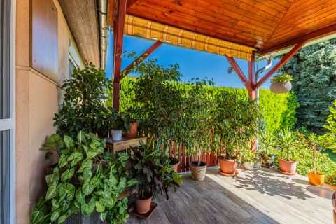 A csodás, gondozott kertben fedett kerti kiülő, grillező, automata öntözőrendszer és robotfűnyíró is megtalálható. A telken egy 30 nm-es garázs + tároló is helyet kapott.