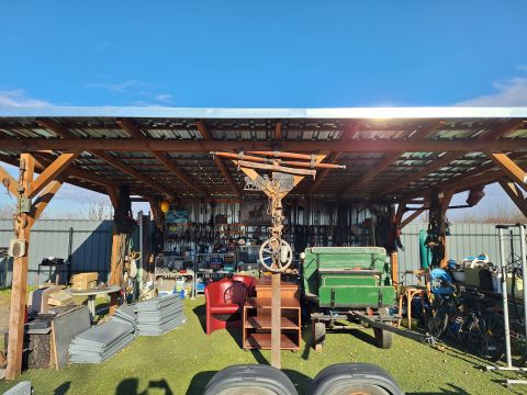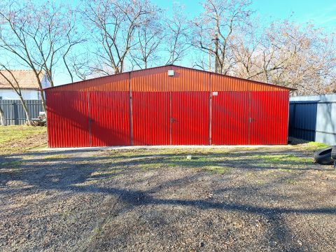 • 60 m²-es lemezépület, amely 3 autó befogadására alkalmas, valamint tárolási/raktározási célokat is szolgál.