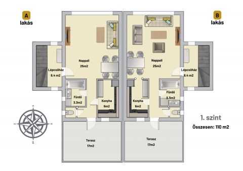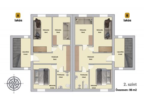 - Mindkét lakáshoz tartozik egy autóbeálló hely, igény esetén garázs kialakítható az alsó szinten.