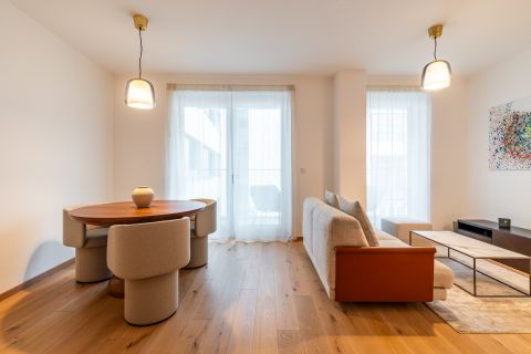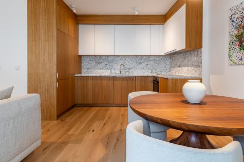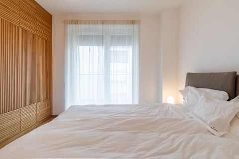 Az apró részletekben is tetten érhető a luxus: rejtett zsanéros ajtók dizájnos Olivari kilincsekkel, a különböző felületek textúráinak harmonikus összhangja, valamint az egyedi, asztalos által készített konyha. A lakásban rengeteg beépített szekrény található, így bőséges tárolási lehetőséget kínál.