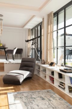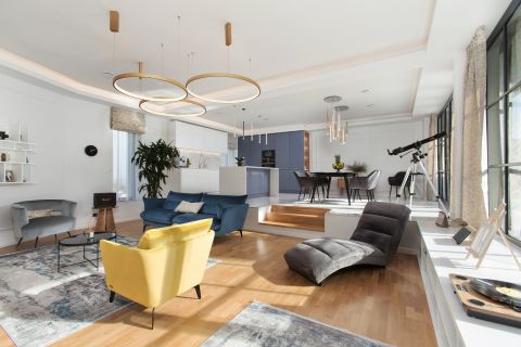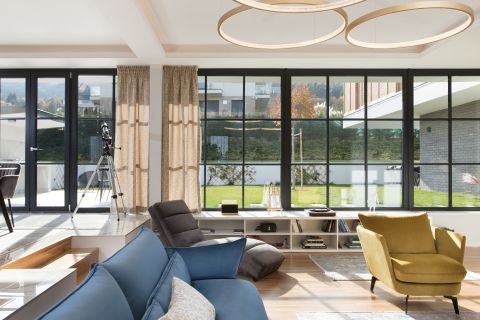 A nappaliban a mennyezetről lebegő arany körlámpák ragyogása szinte ékszerként díszíti a teret, miközben a világos falak és a mély tónusú bútorok közötti kontraszt kifinomult harmóniát teremt. A fény játékossága a padlón szinte megnyitja a teret – mintha maga az otthon is nagylelkűen kitárná karjait.
