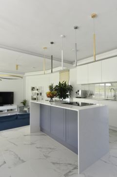 A konyha visszafogottan modern szürke frontjaival és fényes fehér konyhaszigetével egyszerre hívogat főzésre és beszélgetésre.