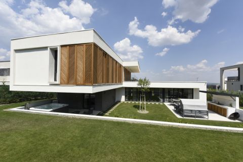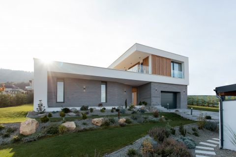 Ez az családi ház nem egyszerűen otthon: ikonikus építészeti állásfoglalás. A hófehér tömegek és a grafitszürke téglaburkolat kontrasztja, a fa lamellák ritmusa és a nagylelkű üvegfelületek együtt olyan vizuális élményt teremtenek, amelyet egy nemzetközi designmagazin címlapján is megcsodálnánk.