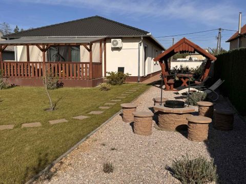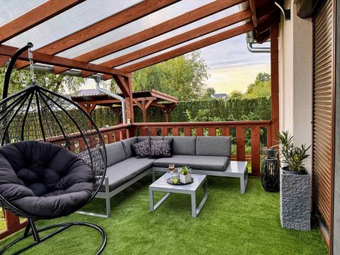 A nyári kikapcsolódást egy kisebb, hangulatos medence teszi teljessé a saját kertben. Az elektromos úszókapu kényelmes és biztonságos behajtást biztosít az ingatlan udvarára, míg a fúrott kút és a beépített automata öntözőrendszer gondoskodik a kert egészségének megőrzéséről, hogy mindig zöld és ápolt legyen a növényzet.