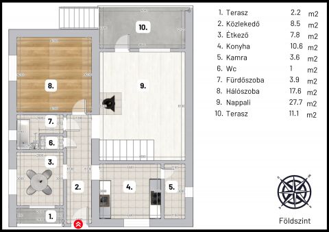 ✅ A 10.6 m2-es ablakos konyhából nyílik egy kamra és a folyosóról egy külön étkező helyiség is.