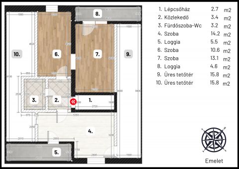 ➡️ Felosztása: lépcsőház, közlekedő, fürdőszoba-WC, 2 db külön nyíló hálószoba 1-1 saját loggia.
