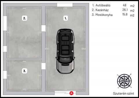 ➡️ A szuterén szint összesen 101 m2 alapterületű, három helyiségre osztott, garázs + kazánház + mosókonyha.