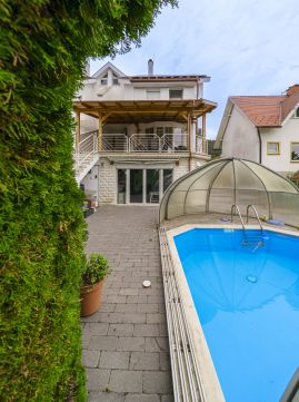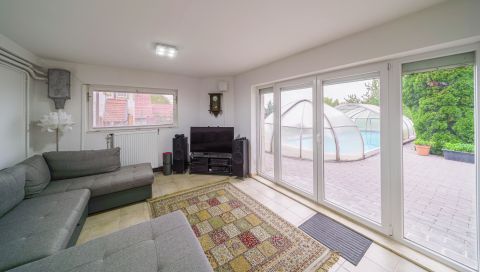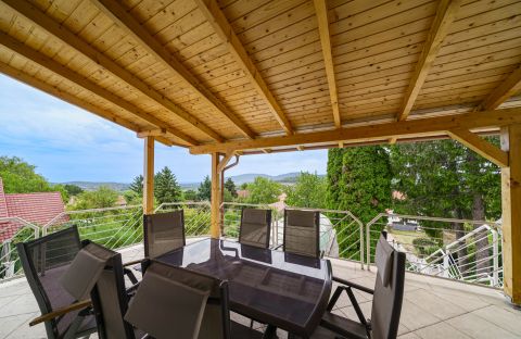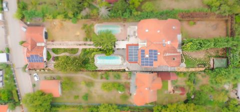 Főbb jellemzők: 375 m² főépület + 35 m² garázs Fedett medence hőszivattyús fűtéssel Zárt garázs két autóra (EV-töltővel) + fedett kocsibeálló 6 nagyobb és 2 kisebb hálószoba Tágas amerikai konyhás nappali étkezővel Minden szinten wc/mosdó Klíma minden helyiségben Óriási fedett terasz lenyűgöző panorámával Teljes UTP-hálózat szobánként, központi szerverhez bekötve Napelem rendszer (12,8 kWh) + hőszivattyús fűtés → rezsimentes működés (EV-töltés is beleértve) Háromfázisú elektromos hálózat (3×32A) Gáz bekötve, használaton kívül.