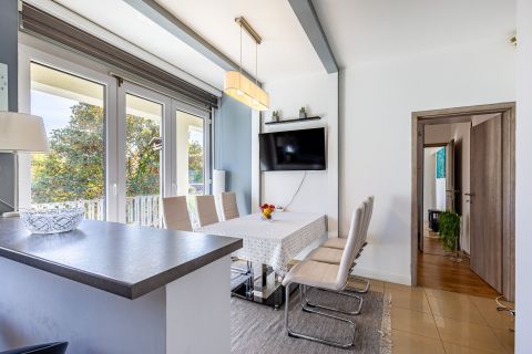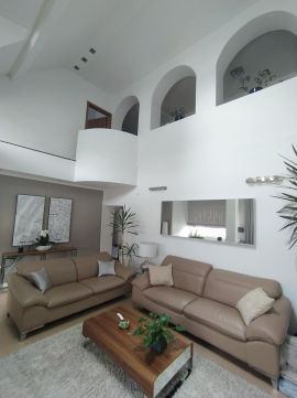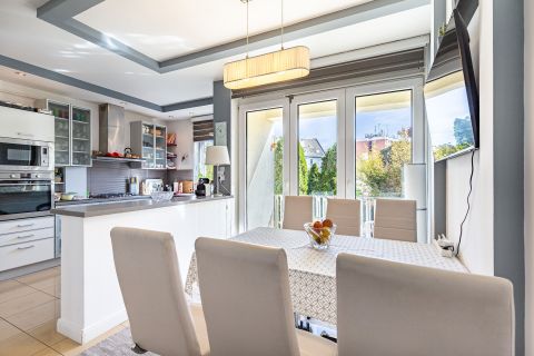 A nappaliban kandalló és a bár-sarok mellett a nyitott légtérben csodálatos boltíves térelválasztási megoldással találkozhatunk. A lakás fűtése gáz-cirko, padló és radiátoros hőleadókkal megoldott. Az összes külső nyílászáró korszerű hő-és hangszigetelt műanyag. A belső nyílászárók a fürdőszobán és a hálószobákon találhatók. A konyhában egyedi tervezésű bútort találunk korszerű gépekkel. Meglepő lehet de kamra is rendelkezésre áll, kiváló pakolási lehetőséget biztosítva. Az étkezőből és a mellette lévő szobából is nyílik kijárat a nagyméretű erkélyre, ahonnan a belső zöld kertre nyílik kilátás. Ennek a kertnek a végében még egy 20 nm-es tároló kiváló lehetőség a kerti bútorok és pl. grillező tárolására.