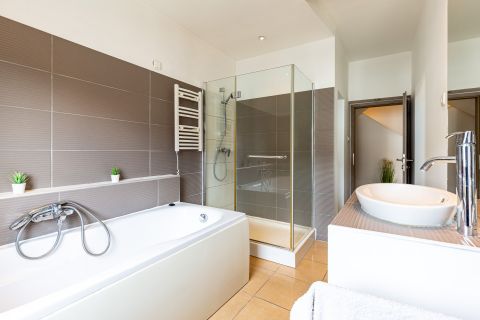 A lakásban összhangban van a burkolatok és a teljes berendezés színvilága, stílusa, ezért igazán elegáns, kellemes otthon.