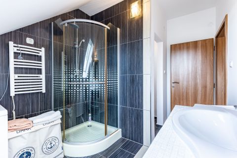 Az alsó szinten egy csodás nappali, fürdőszoba, WC, konyha-étkezővel, kamrával, emellett egy vendégszoba és egy 8 nm-es erkély található. A felső szinten egy nagy méretű tükrös tolóajtós gardrób rejti el a ruhaneműt. Ezen a szinten is van egy fürdőszoba amely tusolós valamint van WC és 2 hálószoba.