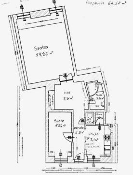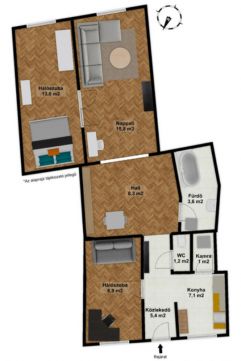 - Nappali, hálószoba, hálószoba, hall, konyha, kamra, fürdőszoba, wc, közlekedő