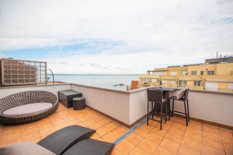 Eladó Siófokon, az Aranypart egyik legkedveltebb részén, egy különleges hangulatú, penthouse jellegű garzonlakás közvetlenül a Balaton partján, a Galerius fürdő mellett!