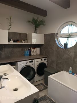 A ház állapota jó, a fűtést Immergas gáz cirkó biztosítja padlófűtéssel, míg a hűtésről klíma gondoskodik, így a nyári melegben is kellemesen hűvös otthont élvezhet. 2024-ben a tetőre egy 15kW-os napelemes rendszer lett telepítve, 10kW-os Huawei akkumulátorral. Átlagos havi rezsi: 25e Ft. (gáz+víz+villany). A melléképületekben háromfázisú áram ki lett építve. Az ingatlan prémium kivitelezésű, a beépített bútorok és szekrények, valamint a LED hangulatvilágítás elegáns és modern megjelenést kölcsönöznek a belső térnek. Az amerikai konyha konyhaszigettel ideális helyszín a baráti összejövetelekhez, ahol a főzés és a társalgás egy térben valósulhat meg. A világos szobák és a rendezett kert még inkább fokozzák az ingatlan vonzerejét.