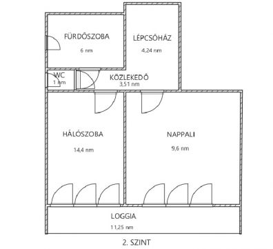 - 2. félszint: tágas nappali loggiával, hálószoba loggiával, fürdőszoba (kád + zuhany), WC