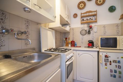 A külön nyíló, ablakos konyha világos és jól szellőztethető. A lakás átlagos, beköltözhető állapotú, konvektoros fűtéssel és klímával felszerelt