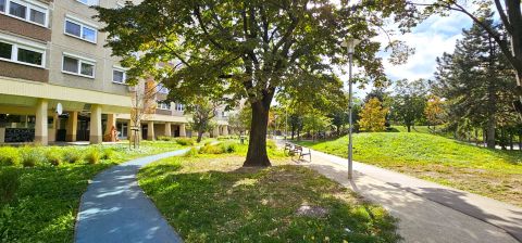 A zöld parkban, padok, futópálya, kültéri kondigépek, játszótér, ping-pong asztal lett elhelyezve.