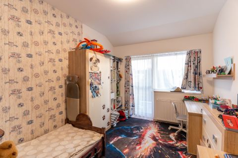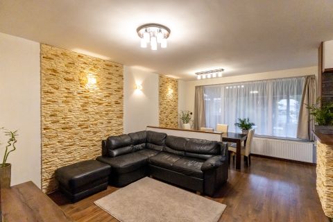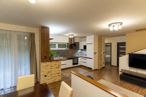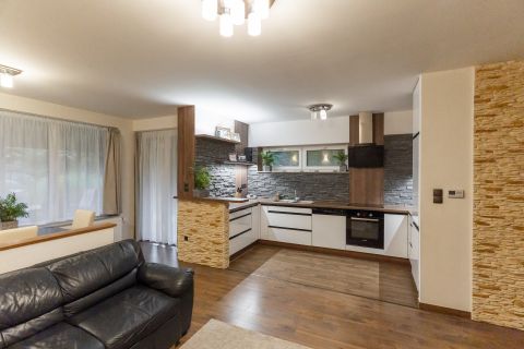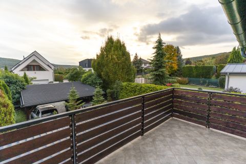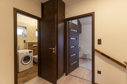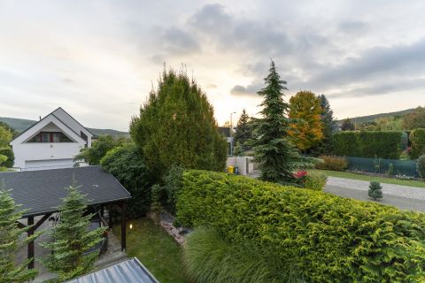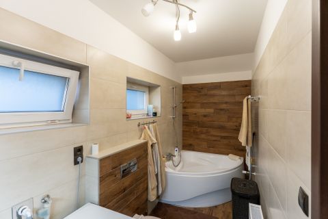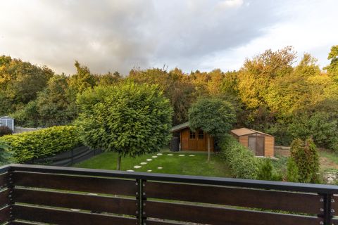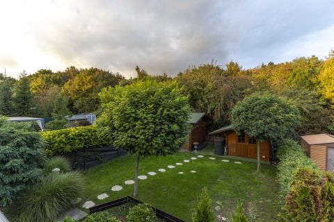 A házhoz tartozó igényes telek vízszintes és a végén gyönyörű erdősáv húzódik amitől még egyedibb és ritkává teszi az ingatlant.